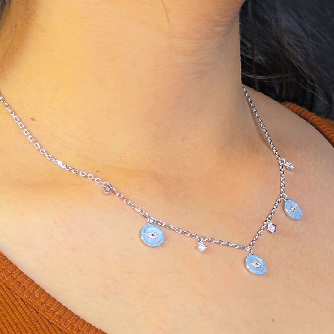 A delicate charm necklace featuring mini blue evil-eye pendants paired with sparkling CZ drops. This stylish piece adds a touch of protection and elegance to your everyday look. Its soft pop of color and minimal design make it perfect for casual, office, and daily wear.