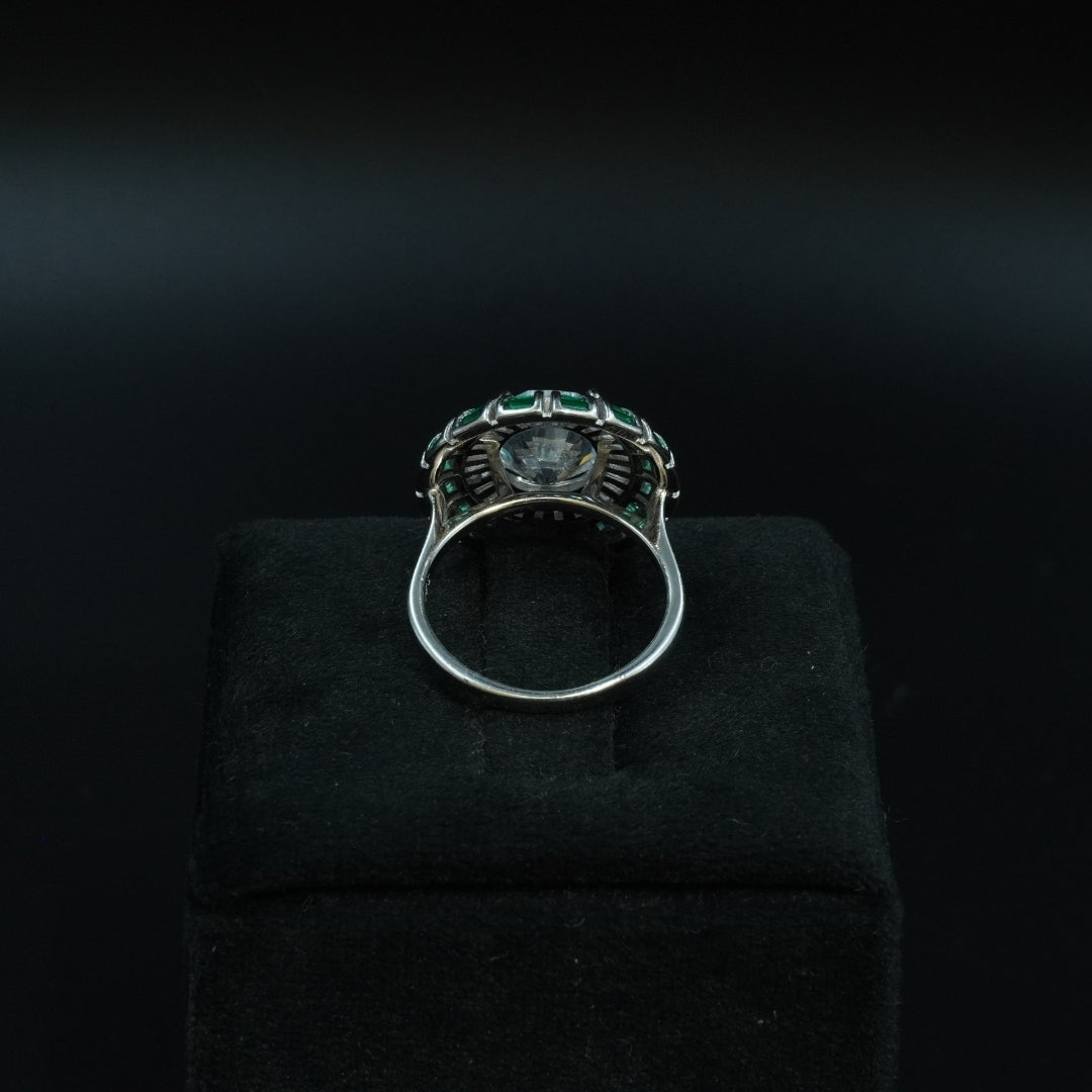 A breathtaking statement ring featuring a large, dazzling center CZ stone surrounded by a halo of vibrant emerald-green stones. The bold circular design gives it a regal, luxurious look—perfect for parties, weddings, and all your special occasions. Lightweight yet striking, this ring is made to stand out.